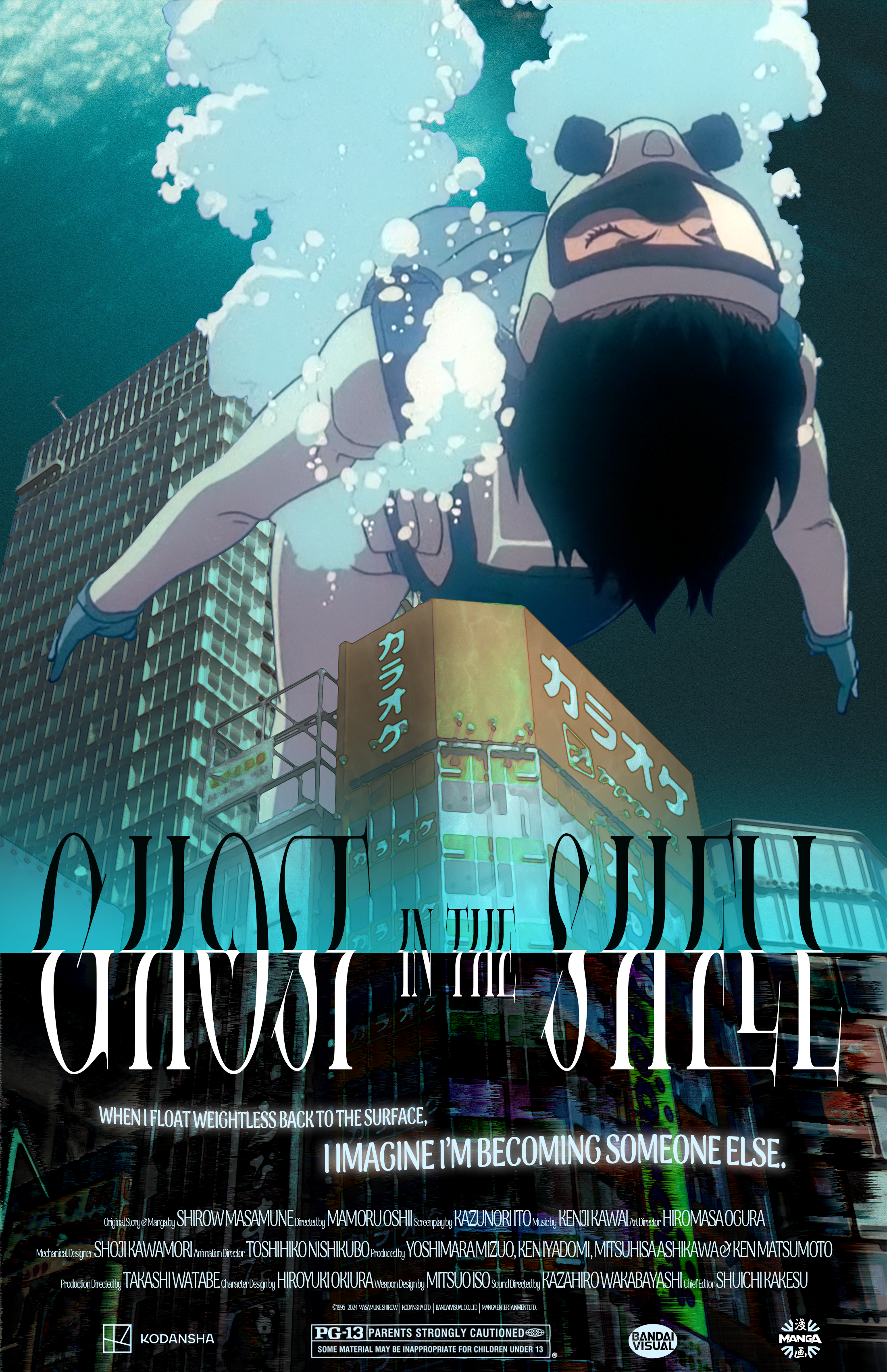 The inspiration for this poster was a blend between the first scene of the movie, when Matoko leaps from the penthouse of a corporate skyscraper without concern for her android body, and the scene roughly midway through the film when she speaks to Batou after diving into the nearby river, sharing a brief glimpse of vulnerability and… perhaps, soul? I briefly entertained redrawing the entire scene, but ended up realizing that Production I. G.’s original cells were above my ability to replicate, and deserved to shine on their own merit, besides.